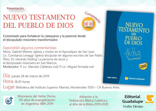 La Congregación del Verbo Divino en Argentina, por medio de su Editorial Guadalupe y en colaboración con la Editorial Verbo Divino de España, invitan a participar de la presentación del Nuevo Testamento del Pueblo de Dios, comentado para fortalecer la catequesis y la pastoral desde el discipulado misionero transformador, el jueves 28 de marzo a las 18:45 hs. en la Biblioteca del Instituto Superior Marista, Montevideo 1050, C.A. Buenos Aires.