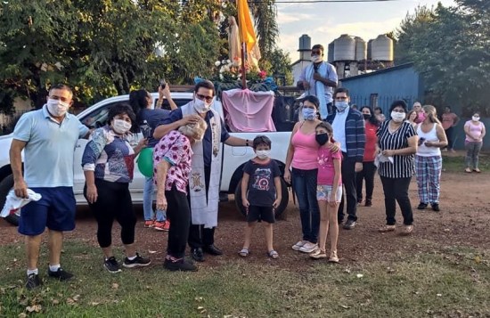Y Dios se apiadó de nosotros, y Jesús le dijo a su Madre: “Tienes que salir porque quieren verte”. Ese día, por la mañana, iniciamos rezando el Santo Rosario y la misa transmitida por Facebook, luego y gracias a Canal 12, desde el Colegio San Roque González de 9 a 11 hs. los niños participaron rezando desde sus casas. A las 11 horas se realizó la misa central con la presencia de Mons. Juan Rubén Martínez, acompañado del provincial y del párroco, la gente no pudo asistir, sino que, desde su casa acompañaron mirando los canales de televisión y las radios que transmitieron a toda la provincia. Ya por la tarde, la Virgen de Fátima recorrió todos los barrios que circunvalan el Colegio y la Parroquia Ntra. Sra. de Fátima, subida a una camioneta la Madre se acercó a sus hijos que no podían venir a verla.