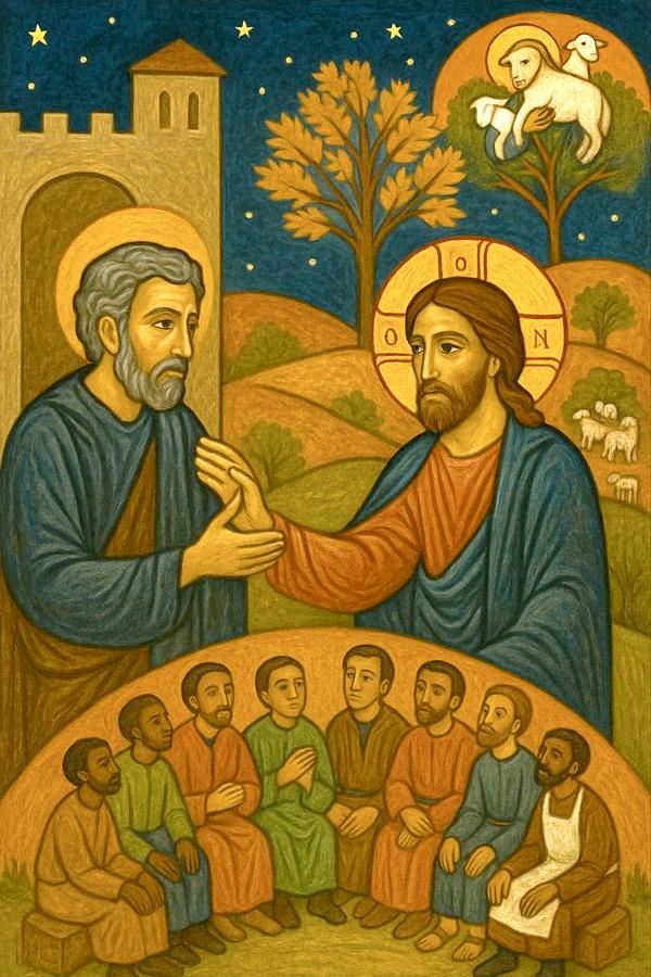En la parte superior, Jesús y Nicodemo dialogan bajo el cielo estrellado, signo de las noches del alma y de las preguntas profundas. Nicodemo, buscador silencioso, representa a cada uno de nosotros cuando, en medio de nuestras dudas o cansancios, nos animamos a salir al encuentro del Maestro. Su gesto de apertura simboliza el deseo de renacer, de comprender, de dejarse tocar por la Palabra viva.